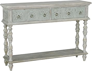This casual look flaunts a medallion pattern along the front. This casual look flaunts a medallion pattern along the front. Show off decor on top. This casual look flaunts a medallion pattern along the front. Distressed river blue 2 drawer entryway console table.